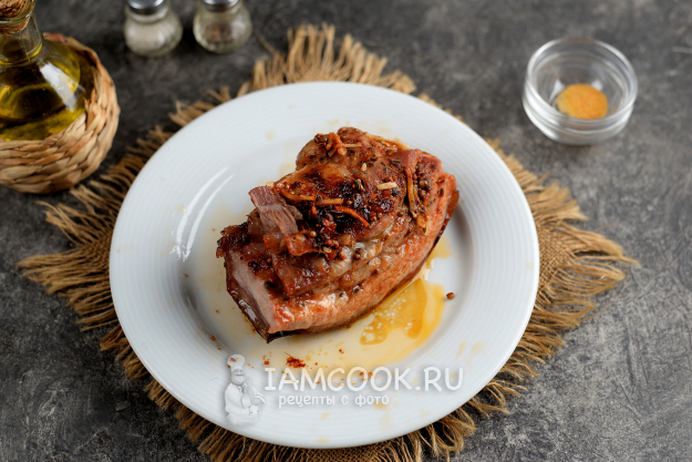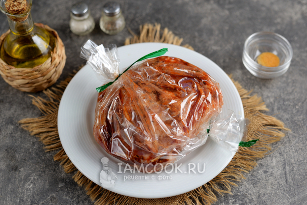 Переложите грудинку в пакет для запекания, завяжите его с обеих сторон, оставьте на какое-то время мариноваться.