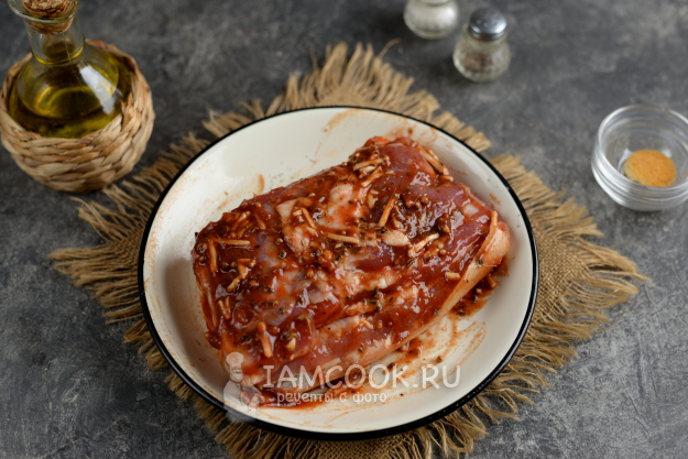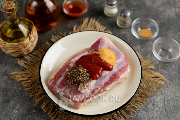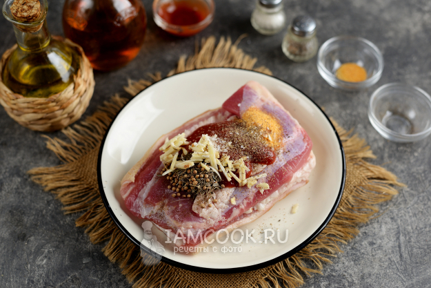 Влейте немного масла, оно поможет быстрее впитаться ароматам приправ и специй в мясо, и уксус, хорошенько натрите маринадом грудинку.