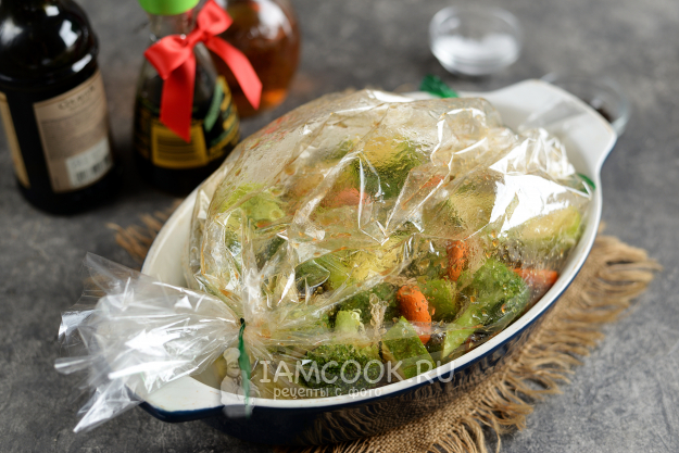 Положите овощи в средний пакет для запекания, завяжите концы с обеих сторон, переложите его в форму для запекания. Отправьте форму в предварительно разогретую до 200 градусов духовку на 30 минут без конвекции.