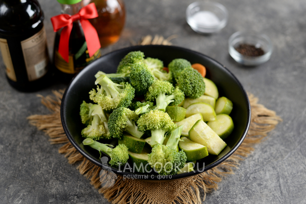 Влейте оливковое масло, уксус и соевый соус, всыпьте молотый перец и соль. При желании соль полностью можно заменить на соевый соус. Для большего спокойствия можно влить пару ложек воды, тогда овощи сразу начнут готовиться на пару, который образуется в пакете.