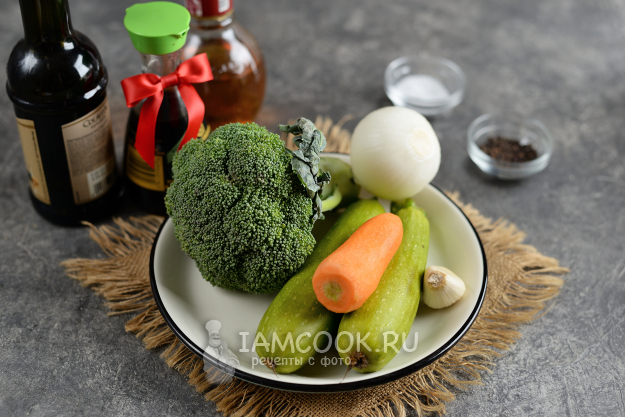 Возьмите необходимые продукты для запекания брокколи с кабачками в духовке. Капусту тщательно промойте под проточной водой, особенно если она фермерская, нужно убрать всех насекомых, которые могут находиться в соцветиях. Для этого растворите в миске холодной воды немного уксуса и положите в нее брокколи, а спустя минут 10 промойте кочан под проточной водой. Лук, морковь и чеснок почистите, помойте вместе с кабачками, срежьте на последних плодоножки.
