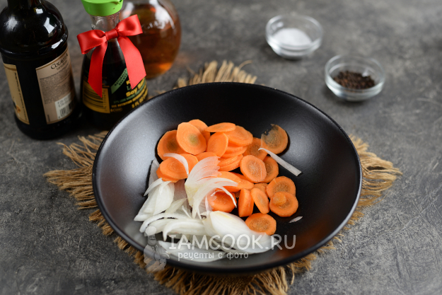 Поскольку кабачки и брокколи запекаются в духовке достаточно быстро, морковь и лук нужно нарезать тончайшими ломтями. Выложите эти овощи в глубокую миску.