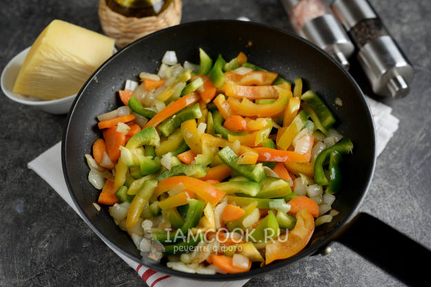 Переложите слегка обжаренные овощи в противень для запекания, чуть посолите их и поперчите.