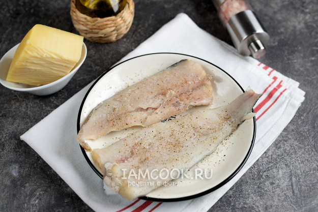 А пока удалите реберные косточки на филе, если есть, натрите минтая солью и перцем с обеих сторон.