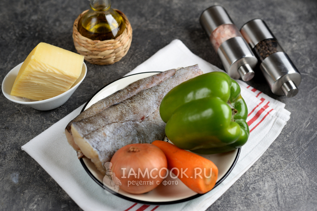 Подготовьте все необходимые продукты для запекания минтая с овощами под сыром в духовке. Лук и морковь почистите, помойте вместе с крупным болгарским перцем. Филе минтая предварительно разморозьте.