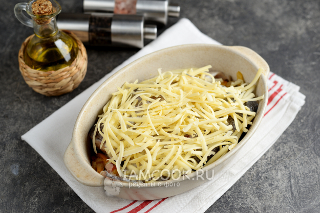 Щедро присыпьте минтая натертым твердым сыром, отправьте форму в предварительно разогретую до 180-190 градусов духовку под верхний нагрев (не гриль!) минут на 25-30.