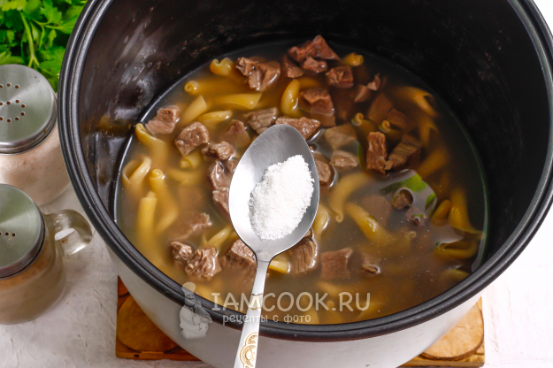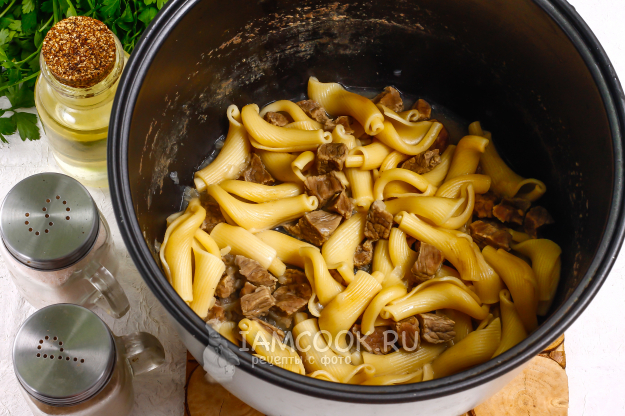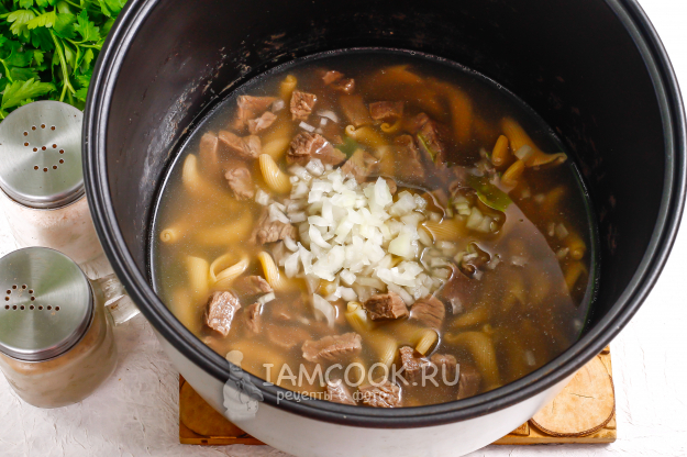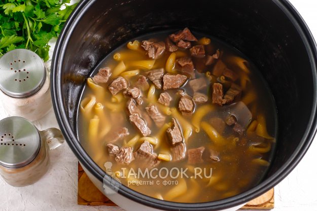 Затем в чистую чашу влейте процеженный говяжий бульон, высыпьте макароны и добавьте обратно отварную говядину.