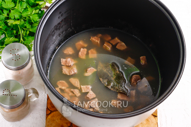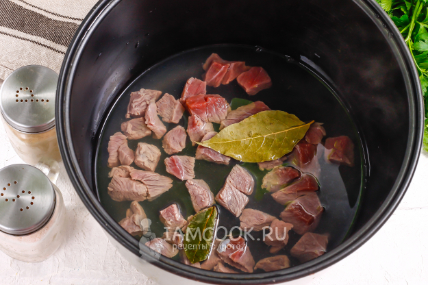 Влейте воду - лучше всего горячую, добавьте лавровые листья. Я не добавляю другие специи или пряности, так как в бульоне от говядины отвариваю и макароны. Активируйте на табло техники режим «Варка» на 40 минут.