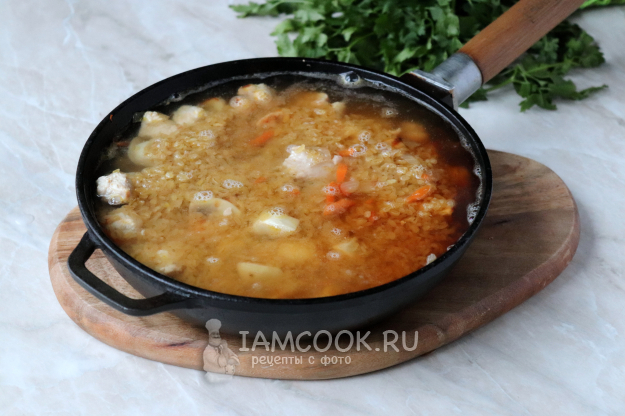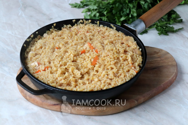 Доведите жидкость до повторного закипания, накройте сковороду крышкой и готовьте на умеренном огне 15-20 минут (точное время приготовления крупы написано на упаковке). Затем снимите варочную ёмкость с плиты и дайте блюду настояться 5-10 минут, после чего аккуратно перемешайте, разложите по порционным тарелкам и подавайте к столу.