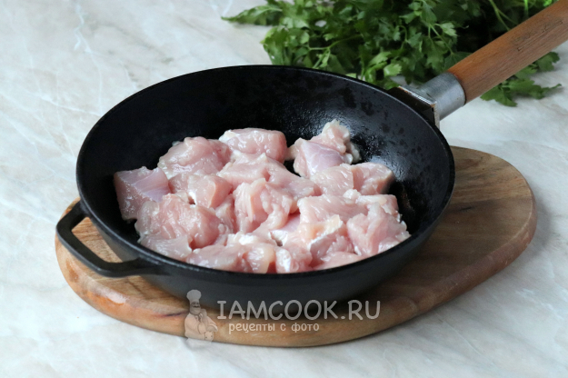 Филе индейки помойте под проточной холодной водой, обсушите и нарежьте на порционные кусочки небольшого размера. Выложите мясо на разогретую с растительным маслом сковороду. Жарьте в течение 3-5 минут, периодически помешивая.