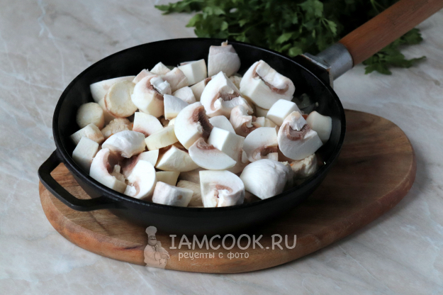 Шампиньоны почистите и разрежьте на 4, а крупные экземпляры - на 6 частей, ножку - пополам. Грибы переложите в сковороду и щедро посолите. Готовьте 10 минут. Шампиньоны сначала пустят много сока, а когда он выпарится - начнут поджариваться.