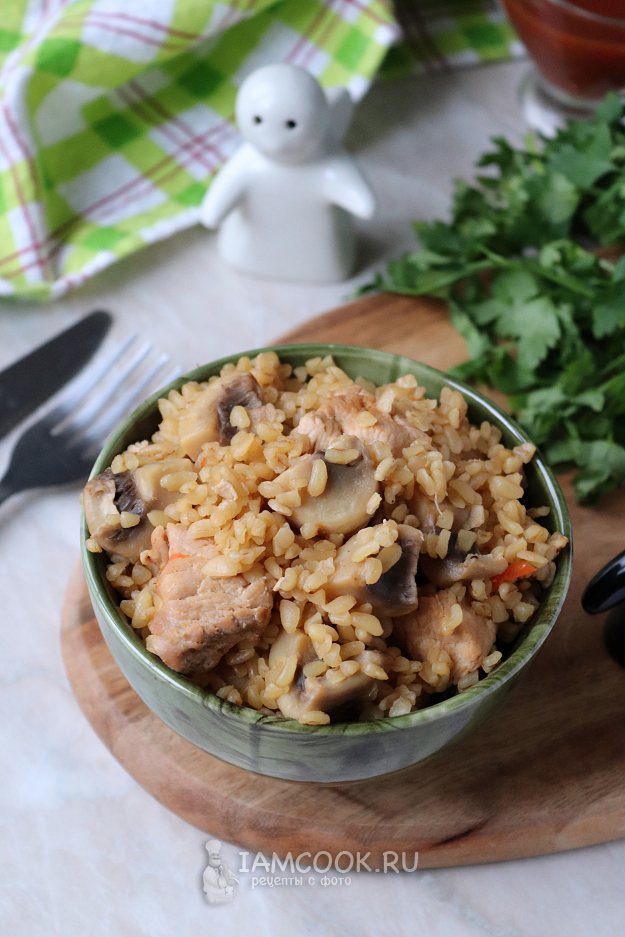 Поверх мяса и грибов выложите булгур, разровняйте его и залейте водою (в соотношении 1:2). По надобности добавьте ещё соли.