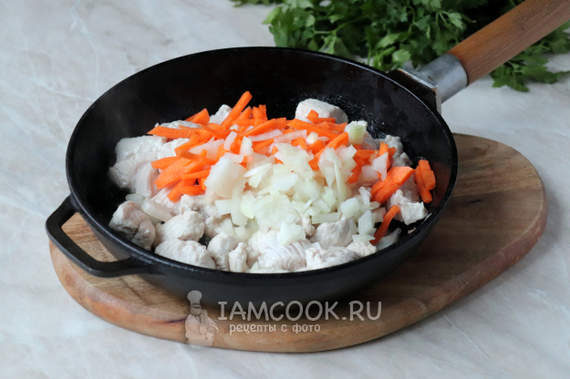 Тем временем подготовьте овощи. Лук нарежьте кубиками, морковь - длинными брусочками (или натрите её на тёрке). Добавьте нарезку к индейке и готовьте всё вместе ещё 5 минут, помешивая.