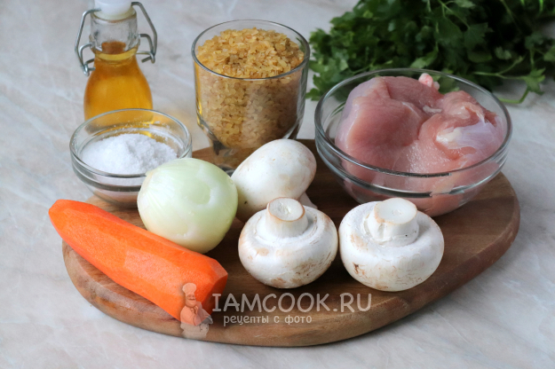 Подготовьте все продукты для приготовления булгура с индейкой и грибами (шампиньонами).