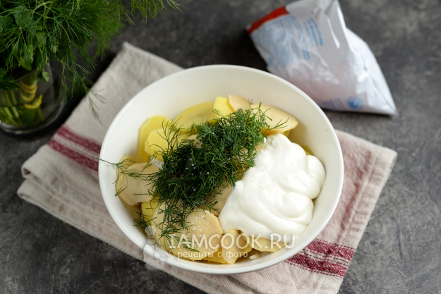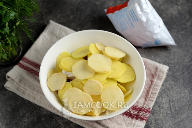 Если вы уверены в сорте картофеля и часто его покупаете для запекания, тогда нарежьте его очень тонкими кружочками, добавьте к рыбе. Если не уверены, тогда лучше отварить в кожуре минут 5-7 и только потом почистить и нарезать.