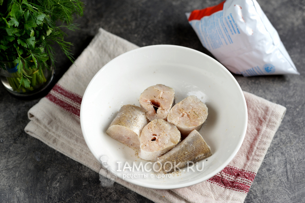 Нарежьте хека крупными кусками, положите в глубокую миску, всыпьте соль и перец по вкусу, выдавите лимонный сок.
