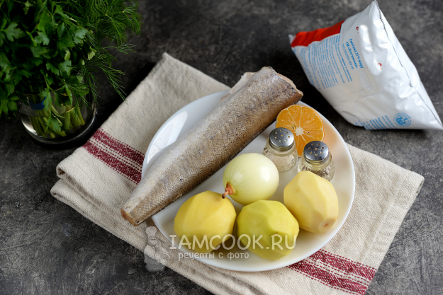 Возьмите все продукты для приготовления хека с картошкой в духовке со сметаной. Рыбу почистите от чешуи, срежьте плавники на спинке и пузе, удалите внутренности. Почистите лук и картофель, помойте, обсушите.