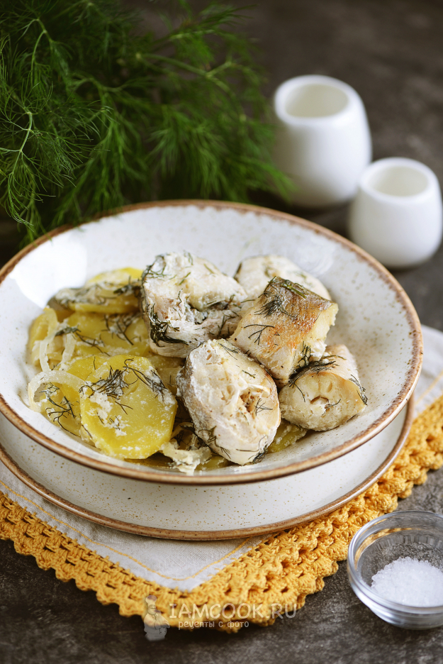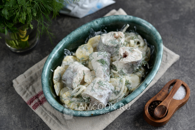 Спустя время простое и недорогое блюдо из запеченного в духовке хека с картошкой и сметаной готово к подаче на стол.