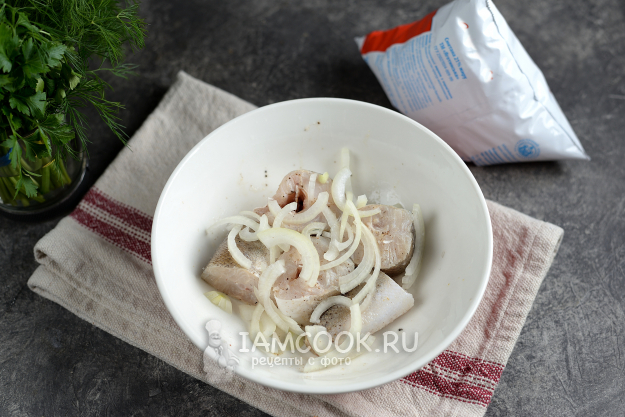 Нарежьте лук полукольцами, переложите к рыбе, перемешайте и оставьте мариноваться минут на 10.