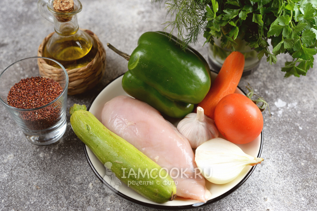 Возьмите необходимые продукты для приготовления киноа с курицей и овощами. Лук, морковь и чеснок почистите, помойте все ингредиенты под проточной водой, вытрите насухо.