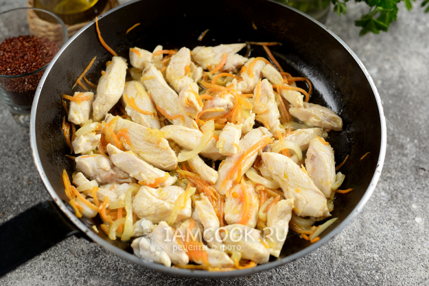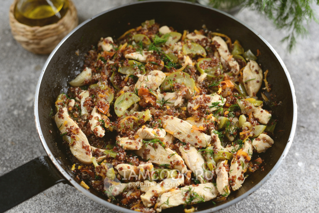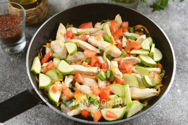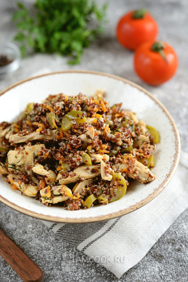 Киноа с курицей и овощами готова к подаче. Приятного.