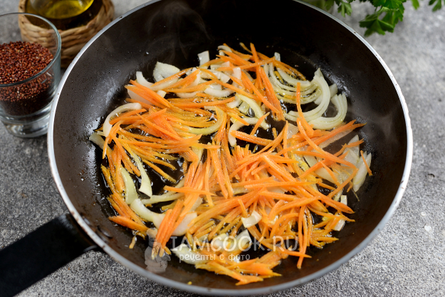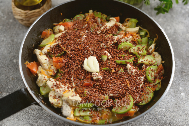 Всыпьте киноа, положите раздавленный зубчик чеснока. Влейте воды или бульона, они должны полностью покрывать все ингредиенты в сковороде. Посолите и поперчите блюдо по вкусу, накройте крышкой и тушите на умеренном огне 20 минут. В процессе можно аккуратно всё перемешать.