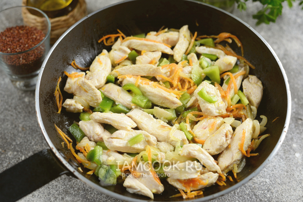 Очистите перец от семян, нарежьте мелким кубиком, переложите к курице, тушите на тихом огне еще 5 минут.