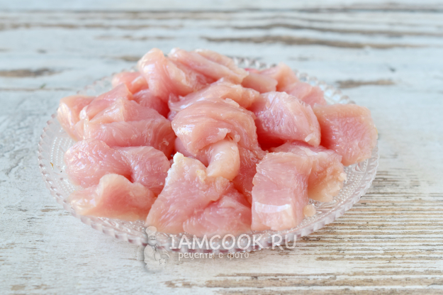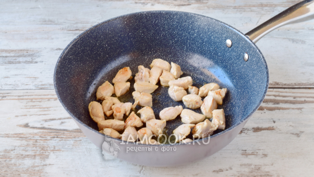 В сковороде на 1 ст.л. растительного масла обжариваем на сильном огне кусочки мяса 3-4 минуты, помешивая, чтобы мясо слегка подрумянилось.