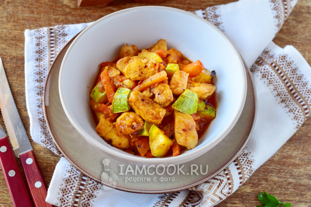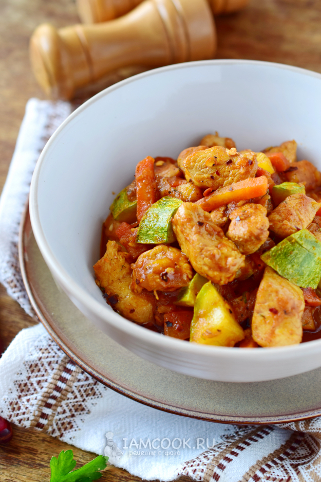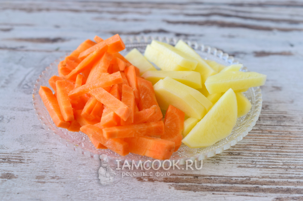 Подготовим все продукты для рагу из индейки и кабачка. Набор овощей для рагу может быть разным, главное - учитывать время приготовления каждого овоща и отправлять их в сковороду в зависимости от этого, либо овощ, который готовится дольше, нарезать на кусочки меньшего размера, чем те овощи, которые готовятся быстро. В моем случае морковь и картофель требуют больше времени для приготовления, поэтому их я добавлю в рагу первыми.