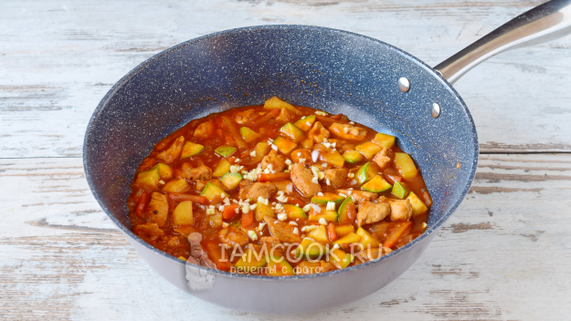 Добавляем в рагу измельченный чеснок. Тушим еще 4-5 минут.