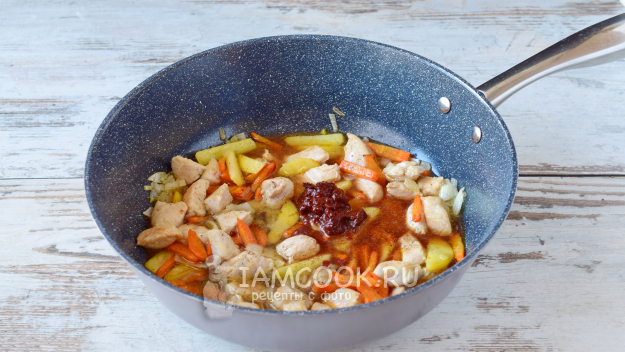 Вливаем 100 мл воды, добавляем соль, перец черный молотый и томатную пасту. Тушим овощи с мясом минут 12-15.