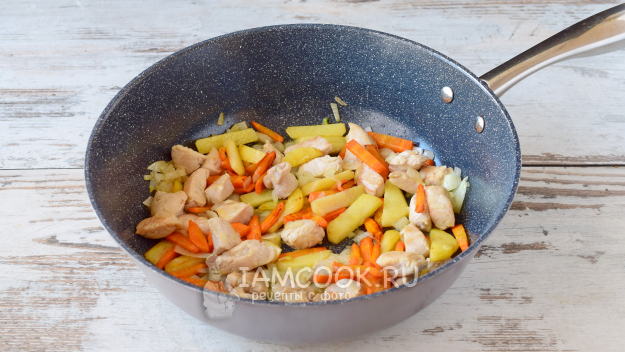 Добавляем морковь и картофель в сковороду к мясу индейки. Обжариваем все вместе еще 4-5 минут на среднем огне.