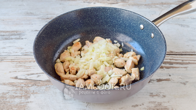 Добавляем овощи в сковороду и готовим на среднем огне 2-3 минуты, пока лук не станет прозрачным.