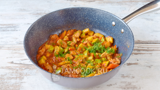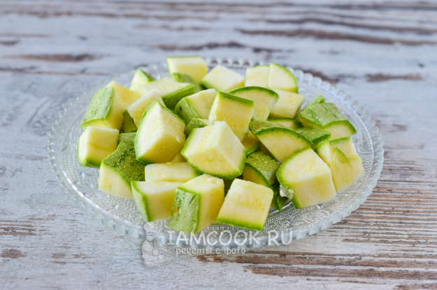 Кабачок нарезаем на кружочки, а затем каждый кружочек режем на четвертинки. И добавляем в рагу. Тушим рагу еще минут 5-7.