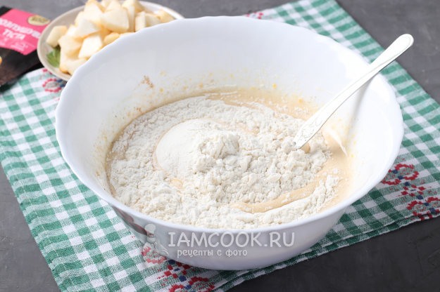 Далее добавить просеянную муку с разрыхлителем и аккуратно перемешать тесто ложкой или лопаткой складывающими движениями.