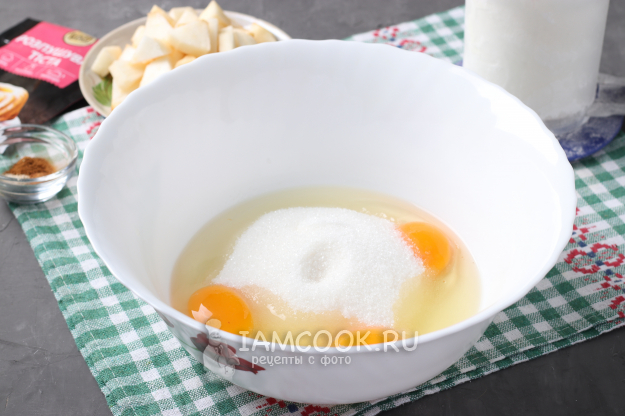 В глубокую миску разбить яйца, добавить сахар и тщательно взбить до пышности.