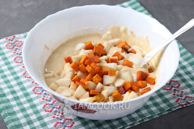 Добавить в тесто яблоки и запечённую тыкву, перемешать ещё раз.