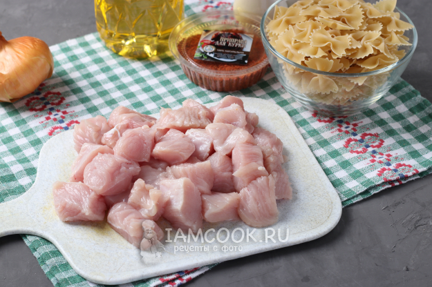 Филе индейки вымыть проточной водой, обсушить и нарезать крупными кубиками.