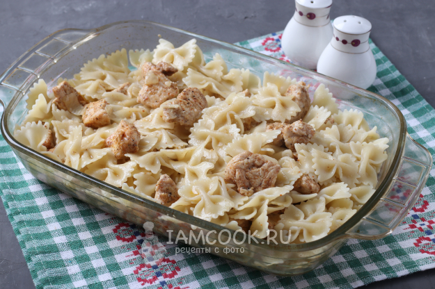 Форму с индейкой достать из духовки, снять фольгу и добавить макароны, перемешать. В форму налить 2-3 столовых ложки воды из-под макарон, чтобы они дошли до готовности, но не пересохли. Поставить форму с макаронами и индейкой снова в духовку на 7-10 минут.