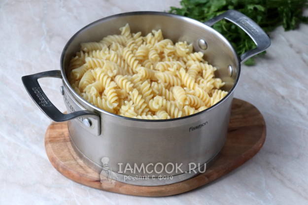 Довести жидкость до повторного закипания и варить макаронные изделия около 10 минут до полной готовности (точное время приготовления указано на упаковке). Откинуть их на дуршлаг, чтобы стекла лишняя жидкость, после чего вернуть макароны обратно в кастрюлю.