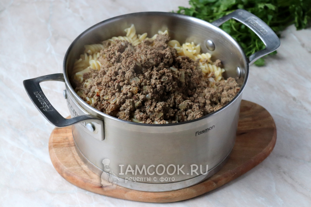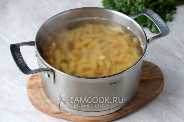 Параллельно вскипятить в объемной кастрюле воду, подсолить её и выложить макароны. Сразу же перемешать, чтобы они не прилипли ко дну.