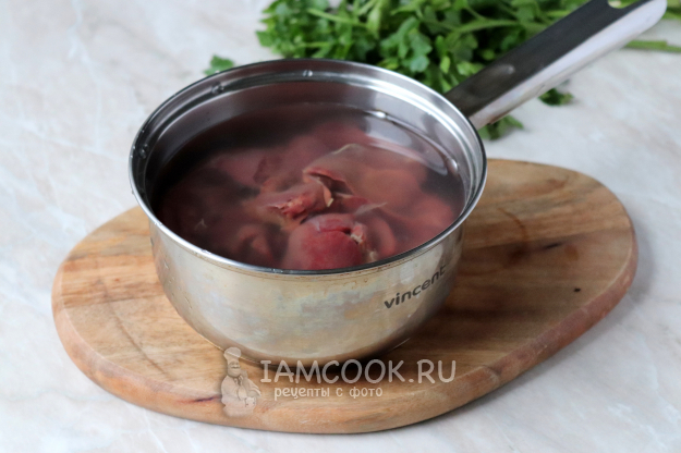 Куриную печень зачистить от плёнок и прожилок, тщательно промыть, после чего залить чистой водой, немного посолить и отправить на огонь. Довести жидкость до кипения и варить на среднем огне 15 минут.