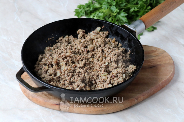 Получившийся фарш добавить к обжаренному луку и готовить всё вместе 1-2 минуты.