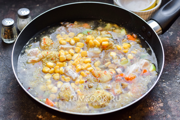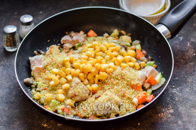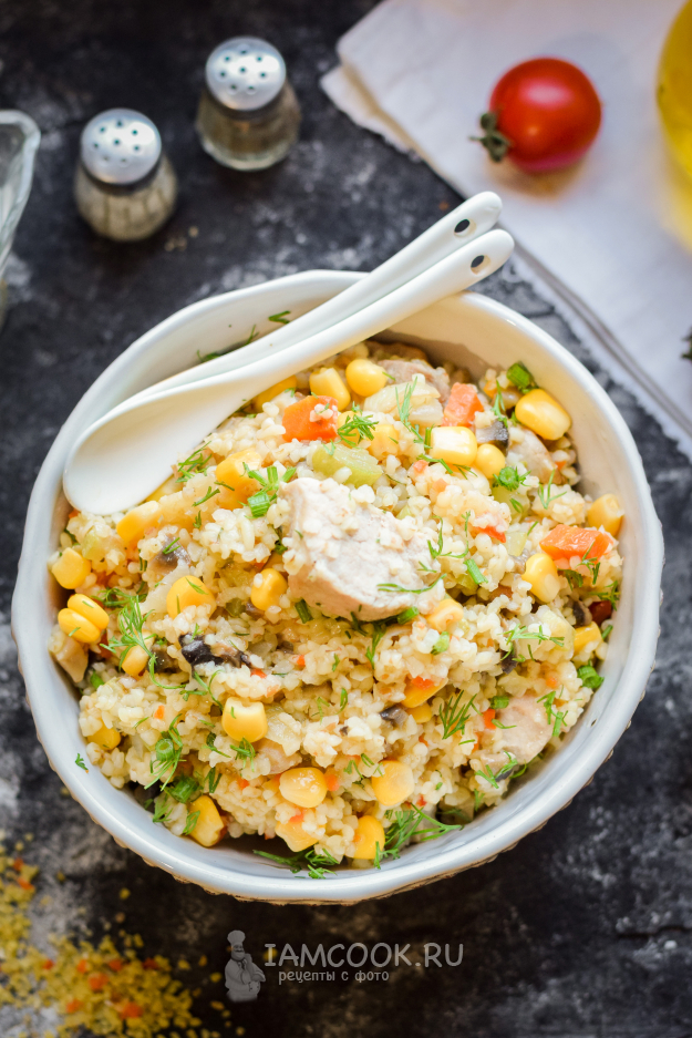 Залить следом горячую воду, всыпать соль и перец по своему вкусу. Перемешать все аккуратно, накрыть сковороду крышкой и готовить булгур со свининой и овощами на небольшом огне 30-35 минут.