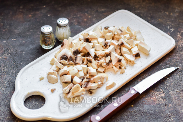 Шампиньоны протереть кухонными влажными салфетками. Нарезать грибы мелкими кусочками.