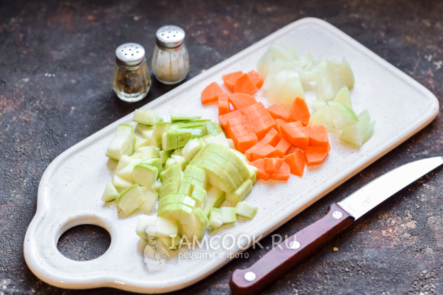 Очистить лук и морковь, овощи сполоснуть и просушить. Нарезать лук и морковь небольшими кубиками, также нарезать кубиками кабачки.