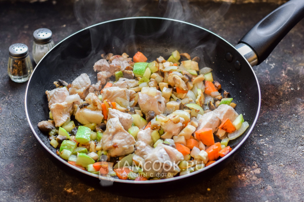 Теперь прогреть хорошо сковороду, влить немного растительного масла, выложить грибы, лук, морковь, кабачки и мясо - жарить все ингредиенты 6-7 минут, помешивая.