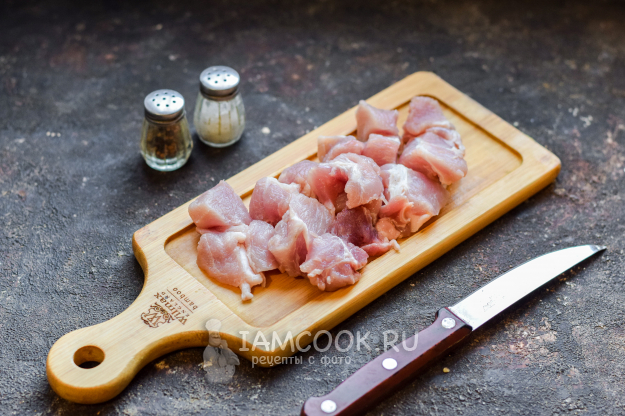 Свинину ополоснуть и просушить, нарезать небольшими кусочками.