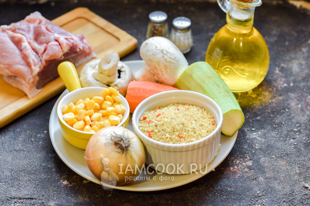 Подготовить все продукты для приготовления булгура со свининой и овощами на сковороде по списку.