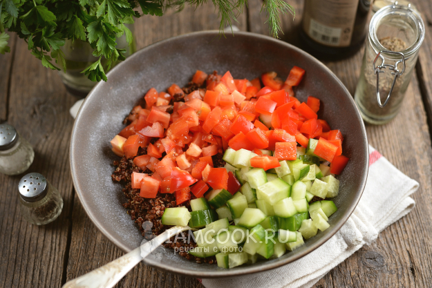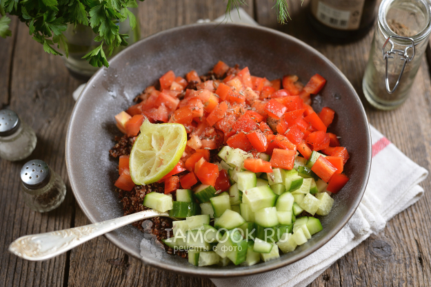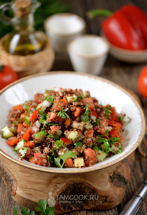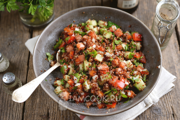 Сочный, вкусный и полезный салат табуле с киноа готов к подаче.